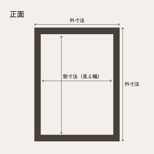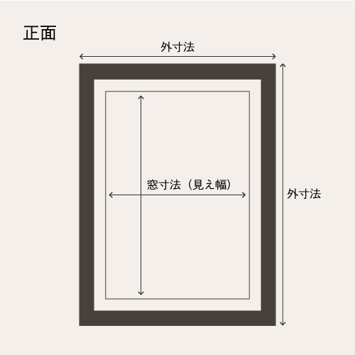 額縁の一番外側の寸法を外寸法、額縁内部の内側の寸法を内寸法、正面から作品が見える寸法を窓寸法(見え幅)と呼びます。飾りたいものに対して、額縁のサイズが合っているかどうかを確かめる時は、額縁の内寸法を確認しましょう。