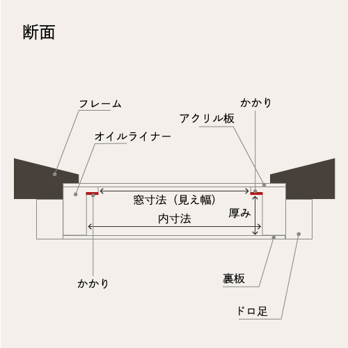 額縁の一番外側の寸法を外寸法、正面から作品が見える寸法を窓寸法(見え幅)と呼ぶことはデッサン額と同じです。デッサン額と異なる点は、油彩額はフレームが入れ子構造になっているところです。油彩額はフレームの中にオイルライナーという入れ子のフレームが入っており、そのオイルライナーの中に飾るものをはめ込みます。そのため、油彩額の内寸法は、フレームではなくオイルライナーの内側の寸法となります。