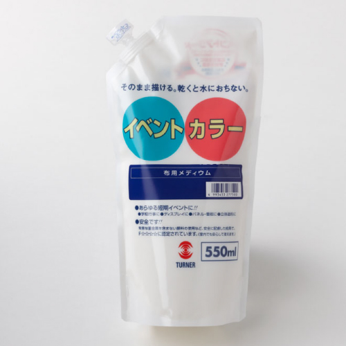 このメディウムをイベントカラーに同量程度混ぜると布などへの定着性が増し、ひび割れや剥離を防止します。