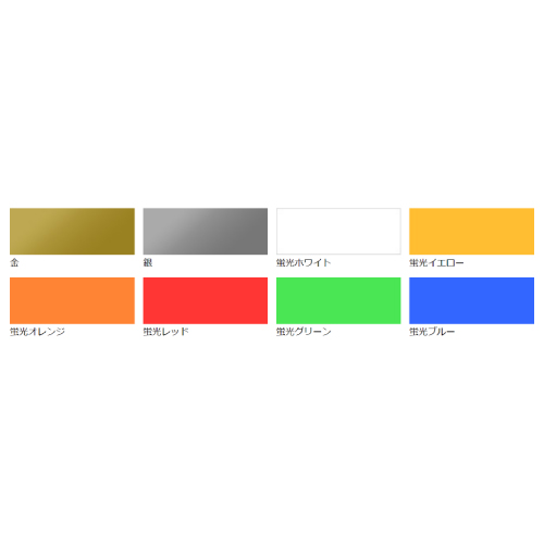 金・銀と蛍光色6色は鮮やかに目立つキメ色に!看板やパネルなど、目立たせたい部分に最適です。また蛍光色はブラックライトを使ったアレンジも楽しめます。