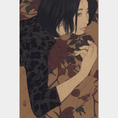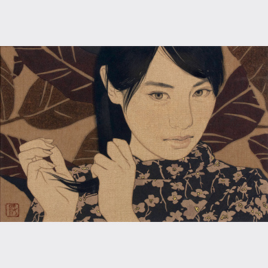 1965年大分県生まれ。日本画家。独学で日本画を学び、自身で染め上げた麻布に岩絵具で描く美人画が、独特な質感と芳香を放つ。