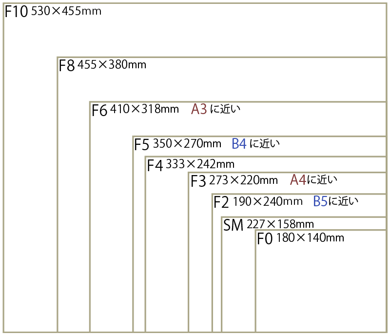サイズ展開は、絵画サイズ(F規格)が多くを占めます。
