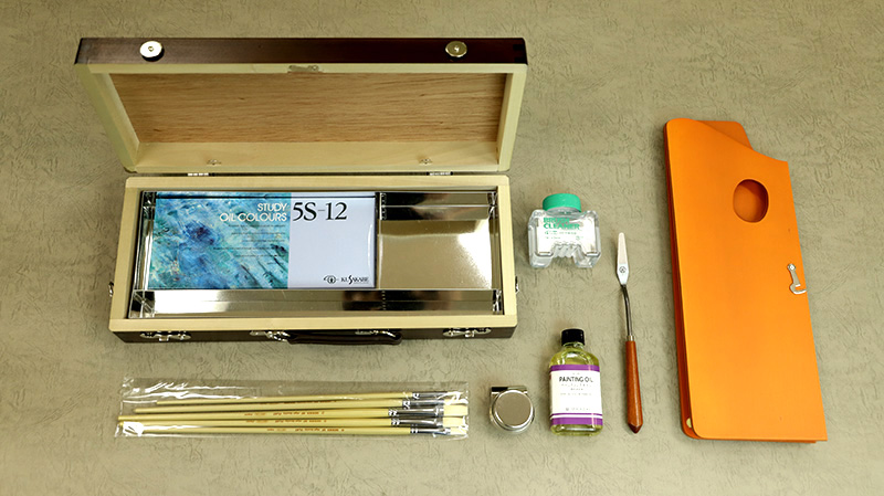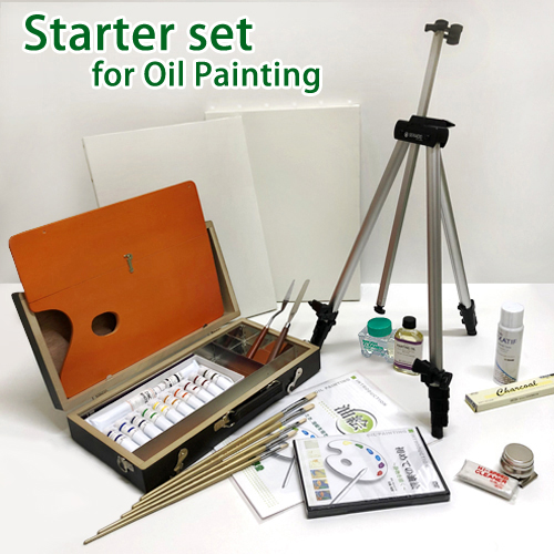 画箱セットに加えて、F6キャンバスが2枚、折り畳み式のアルミイーゼル、DVD「はじめての油絵」、A4版小冊子「油絵入門」がついたスターターセットです。すぐに制作に取り掛かることができ、技法も学べます。