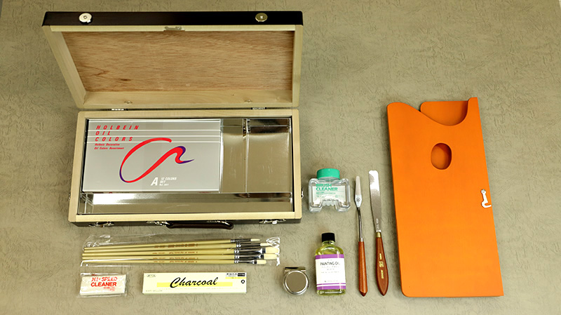 画箱は大判サイズで、油絵具セットは「ホルベイン 油絵具 Aセット[習作用] (20mlx11色+50mlホワイト)」。