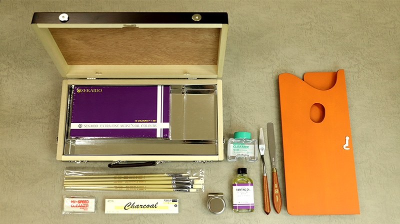 画箱は大判サイズで、油絵具は「世界堂 油絵具12色セット」。世界堂オリジナルの油絵具が入ったセットです。
