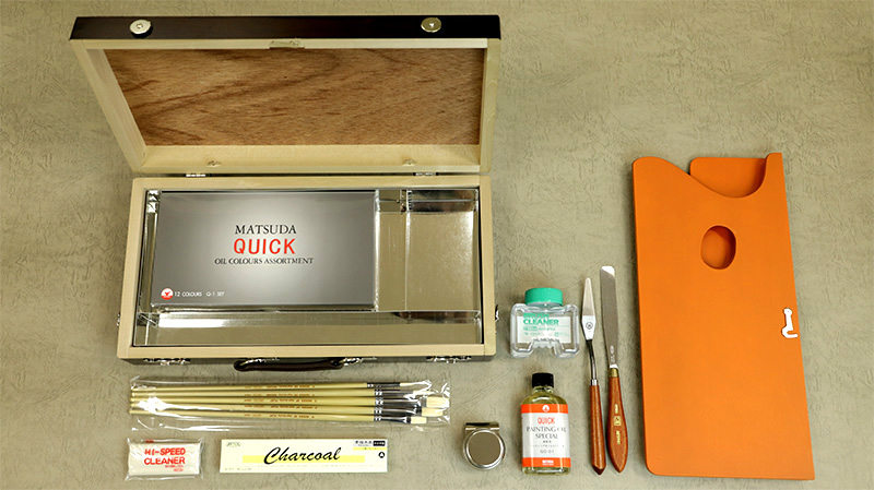 画箱は大判サイズで、油絵具は「マツダ クイック速乾性油絵具20ml 12色セット (20mlx11色+50mlホワイト)」。画用液も速乾性の「マツダ クイック画用液 ペインティングオイルSP 55ml」です。油絵具に速乾性のものが選ばれているので、時間がない方にもおすすめです。