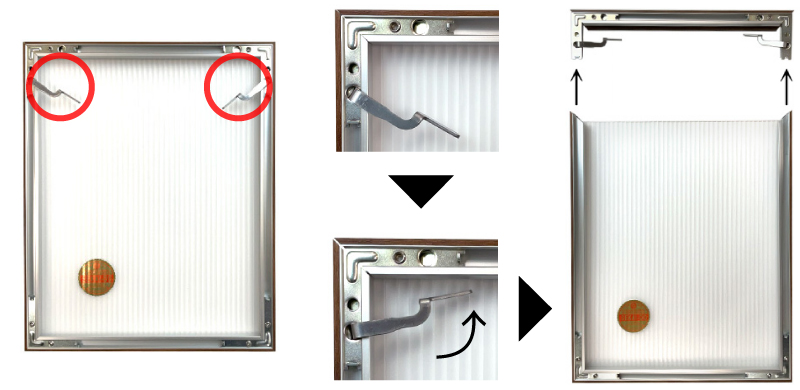 額裏側2ヶ所にワンタッチレバーが付いており、レバーを上げると額の一辺を外すことができます。