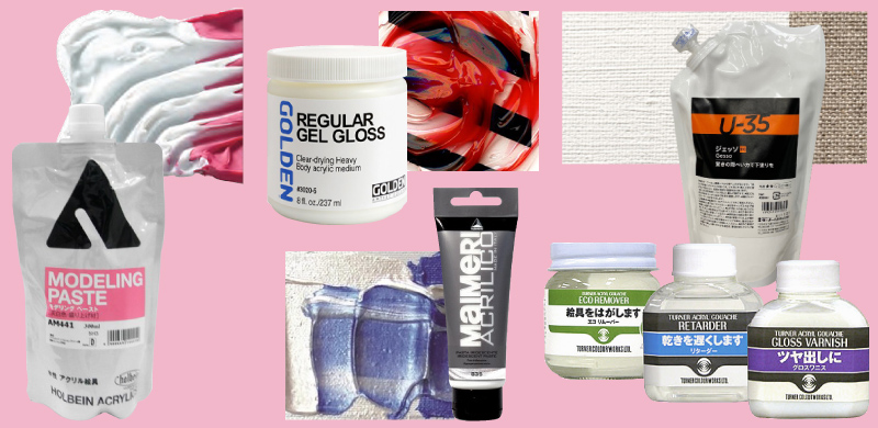 アクリル絵具の専用メディウムは、各メーカーから様々な用途の物が展開されています。