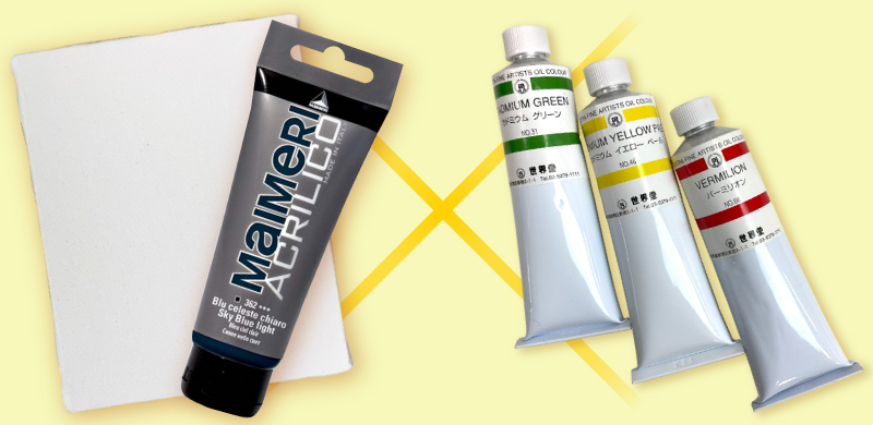 例えば、アクリル絵具用のジェッソを使用した上で油彩を描いたり、下絵を描くときのみにアクリル絵具を使用するといった併用方法が可能です。