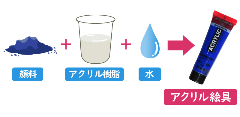 アクリル絵具は、色の元となる顔料とアクリル樹脂を練り合わせて製造されています。
