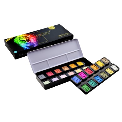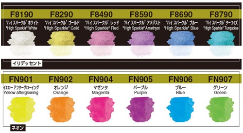 天然アラビアゴムと最高級の蛍光顔料をベースに製造された透明水彩絵具です。
