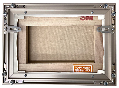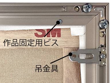 額縁を組み立てた後に作品を正面からセットし、裏面からビス(長さ13mm)で固定します。その後、吊金具にヒモを通せば完成です。