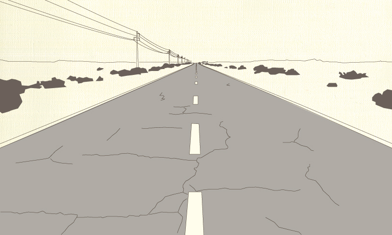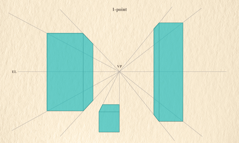 消失点を1点設定し、その消失点へ向けて収束する線を基準にして立体空間を表現する技法です。対象を正面から見た場合の奥行きを表現するのに適しています。