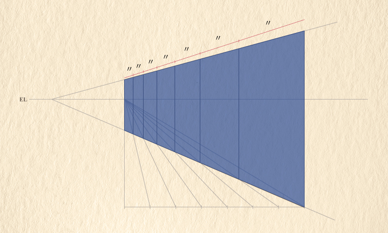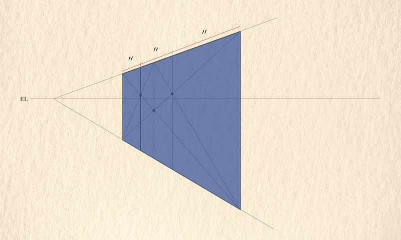 対象の両端と同じ長さの水平線を図のように描き、その水平線をまず分割します。対象の奥の端の辺とアイレベルの交点から、分割した境目の点へ線を引き、対象の下辺と交わった点から垂直線を引くと、同じ数の分割ができます。