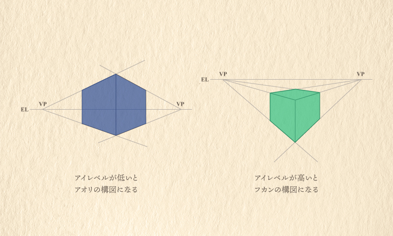 アイレベルとは視点の高さです。対象を上から見ている場合(フカン)は、アイレベルの線は対象の上のほうにきます。対象の下から見ている場合(アオリ)は、アイレベルの線は対象の下のほうにきます。透視図法で設定する消失点はアイレベルの線上に設定します。