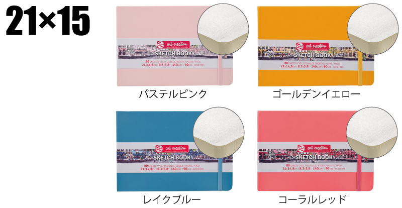 21×15cmサイズにパステルピンク、ゴールデンイエロー、レイクブルー、コーラルレッドが追加されました。21×15cmサイズは横長のブックで、風景画をスケッチしたりするのに向いています。