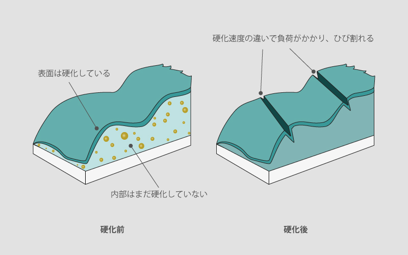 絵具が盛り上がった厚塗り部分は表面が先に硬化し、内部は柔らかいままとなります。後から内部が縮むことによって、深いひび割れが生じます。