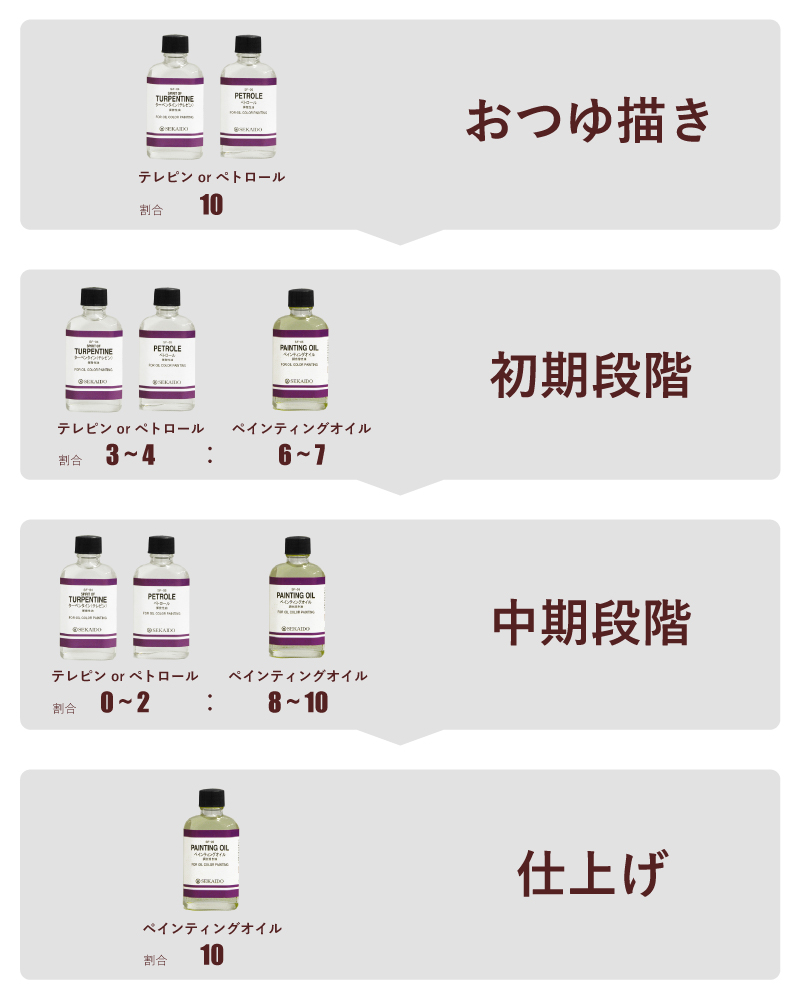 基本的な油絵の描き方では、描き始めは揮発性油のみで絵具をうすめて描きます。この工程は「おつゆ描き」と呼ばれます。揮発性油は、揮発して早く乾くため、最初のおつゆ描きや初期段階では多めに使用されます。下の層を乾かしながら、描き進めるにつれて少しずつ乾性油の割合を増やしていきます。