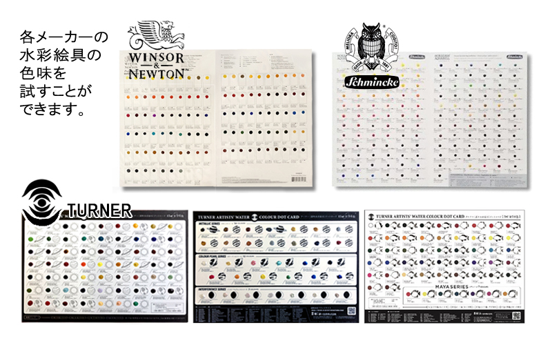 紙の上に予め水彩絵具を充填し 固めたもの。自分の水彩色見本を作成したいときや 気になるメーカーの水彩絵具を少量ずつ試したい場合などに適しています。