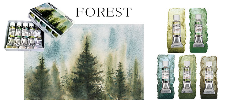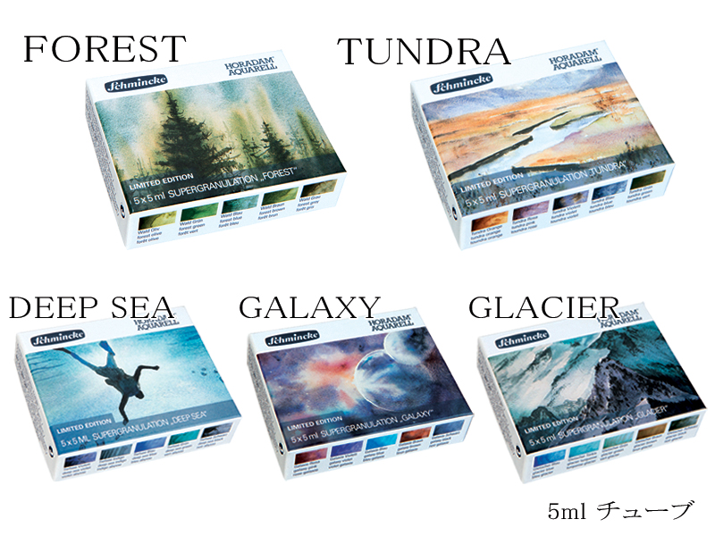シリーズは「フォレスト(森林)」「ツンドラ(凍原)」「ディープシー(深海)」「ギャラクシー(宇宙)」「グレイシャー(氷河)」の5種類。各シリーズ5色(5mlチューブ)のセットになっており、それぞれのイメージに合った色味の絵具がまとまっています。