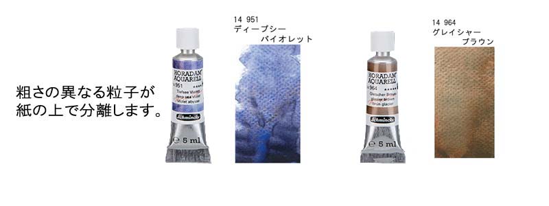 2種類以上の顔料を合わせて絵の具を練ることで、紙目に粒子が溜まる「スーパーグラニュレイティング」(粒状化)の効果がより強調された水彩絵具。塗布すると紙の上で顔料が分離し、色味が別れます。