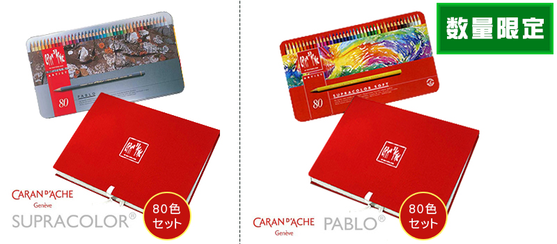 「パブロ色鉛筆」「スプラカラー水彩色鉛筆」の80色セットに 数量限定ノベルティ【F4布貼りスケッチブック】が ついてきます。