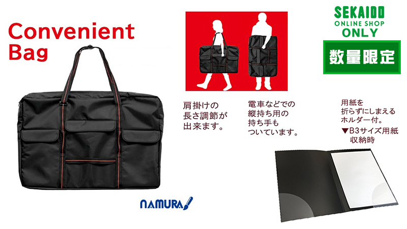 B2サイズの木製パネルが2枚ゆったり入る、撥水加工のバッグ。外側のセンターと両サイドにポケットがついており、A4資料やスケッチブックも一緒に持ち運べます。肩掛けの長さも調節できるほか 縦に持つための持ち手もついています。用紙を折らずにしまえるホルダー付。