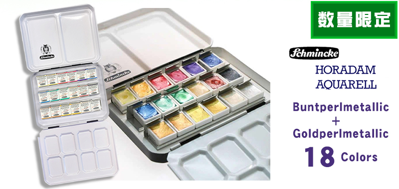 シュミンケホラダム水彩絵具に 希少価値の高いパール色、メタリック色をまとめた18色ハーフパンセットが登場しました。非常に柔らかく溶きやすく、少量でもしっかりと画面に輝きを残します。定番色の仕上げや、ポイントカラー、差し色に便利です。