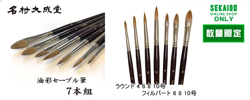希少価値の高いセーブル(テンの毛)を使用した油彩筆のセット。扱い易い、4号~10号の大きさの筆がまとまっています。計7本。