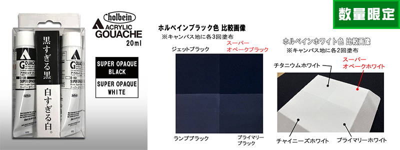 ホルベインのアクリリックガッシュで 最も黒かったジェットブラックを超える漆黒度の「スーパーオペークブラック」、最も白かったチタニウムホワイトを超える白色度の「スーパーオペークホワイト」が、セットになって数量限定で新登場。いずれも超不透明色で隠蔽力が特に強く、着色力も抜群のアクリル絵具です。
