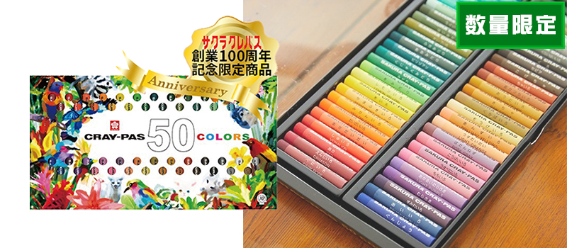 鮮やかな発色・豊富なカラー展開で、グラデーションや陰影などが細かな表現も可能なクレパス50色セット。滑らかな塗り心地で、混色・重色などの様々な技法を楽しむことができます。パッケージは、サクラクレパス創業100周年記念の限定版。世界の動物を集めたにぎやかで、色鮮やかなデザインになっており、パッケージの窓からクレパスの美しいグラデーションが見えます。