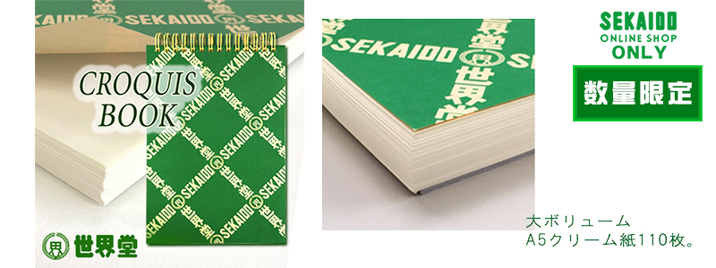 世界堂のお店で見かける手提げ袋のデザインをそのまま表紙にしたクロッキーブック登場!使いやすいクリーム紙110枚をツインリングで綴じたボリュームたっぷりの1冊です。携帯に便利なA5サイズで、ちょっとしたスケッチやアイデアノートとして手軽にお使いいただけます。