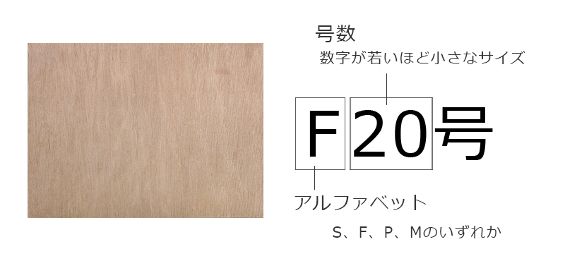 キャンバスや木製パネルには 大きさを区別する指標として、0から始まるサイズ(号数)表記のほか、数字の頭に「F」「P」「M」「S」のいずれかのアルファベットがはいります。