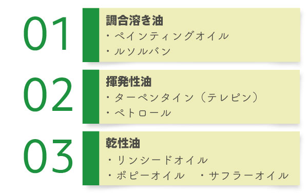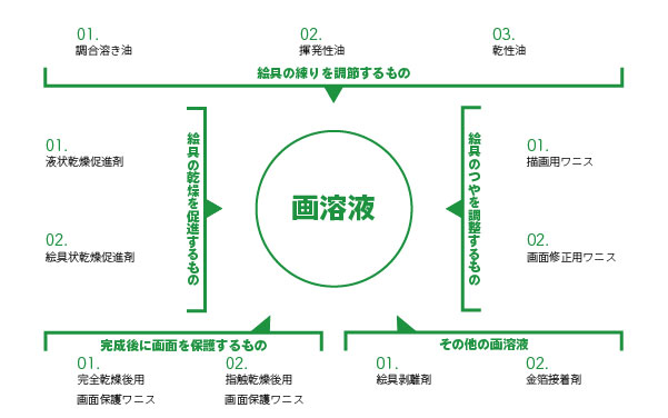 まずは画溶液の種類からみていきましょう。たくさん種類のある画溶液ですが、おおまかなジャンルにわけると、あんがい単純に分類できます。画溶液は大きくわけて絵具の練り調子を整えるもの、絵具の乾燥を促進するもの、絵具のつやを調整するもの、完成後に画面を保護するもの、その他の画溶液に分類できます。そしてこれらの中にはさらに種類があり、どのようなオイルを使用するかによってさまざまな絵肌を表現でき、絵具が乾燥するスピードもコントロールすることができます。