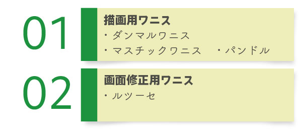 描画用ワニスとは、乾性油と揮発性油と調合して、絵具を溶くために使用するワニスです。描画用ワニスには代表的なもので、ダンマルワニス・マスチックワニス・パンドルがあります。