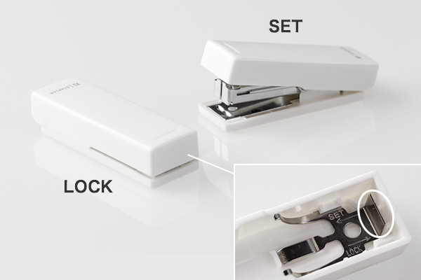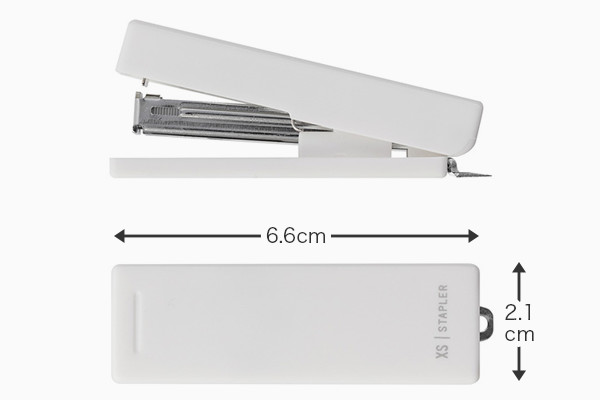 「XS(エックスエス)」シリーズのホッチキス。小さいのに、コピー用紙10枚まで留めることができます。外出先で書類を作成するときに活躍します。使用しないときは、中の押し刃をスライドさせてロックすることができます。