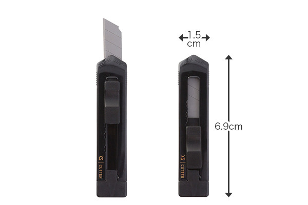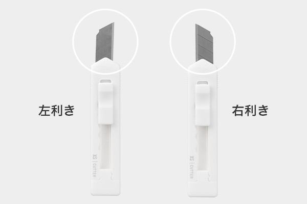 「XS(エックスエス)」シリーズのカッター。手になじんで使いやすい大きさです。刃をセットする向きを変えることで「右利き」「左利き」両方に対応します。