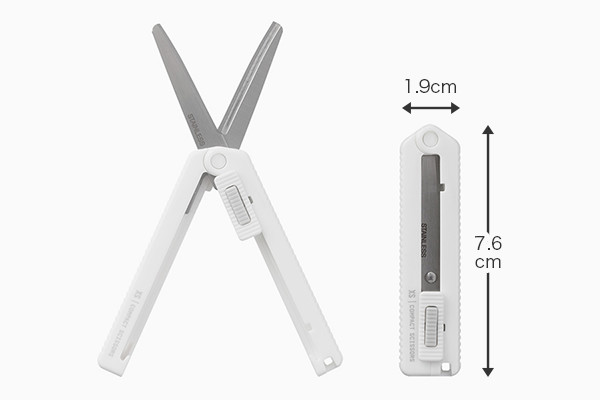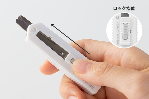 「XS(エックスエス)」シリーズのハサミ。スライドして刃を収納できるので、ポケットに入れて携帯しても安心です。刃はのりがつきにくく、厚めの紙もしっかりと切れるように設計されています。ストラップが付けられるフック穴付。