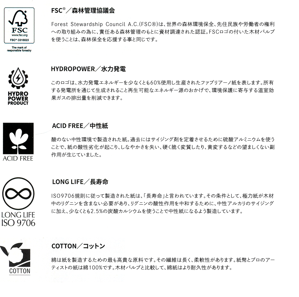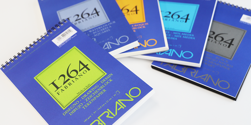 "ファブリアーノ1264"シリーズは、個々の技法ごとに細分化した、様々な技法に合わせて設計されたスケッチブックです。このシリーズは、再生可能エネルギーである水力発電やFSC認証に順守した環境影響にも配慮して製造されています。中性紙であることはもちろん、ISO9706規則に従い製造された長寿命紙でもあり、紙自体も高い品質を維持しながら作られています。