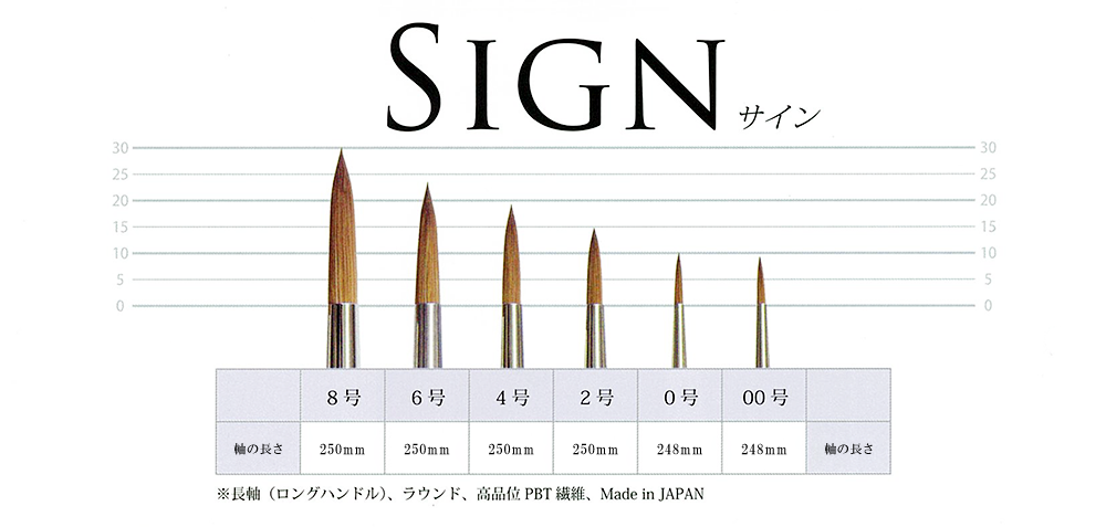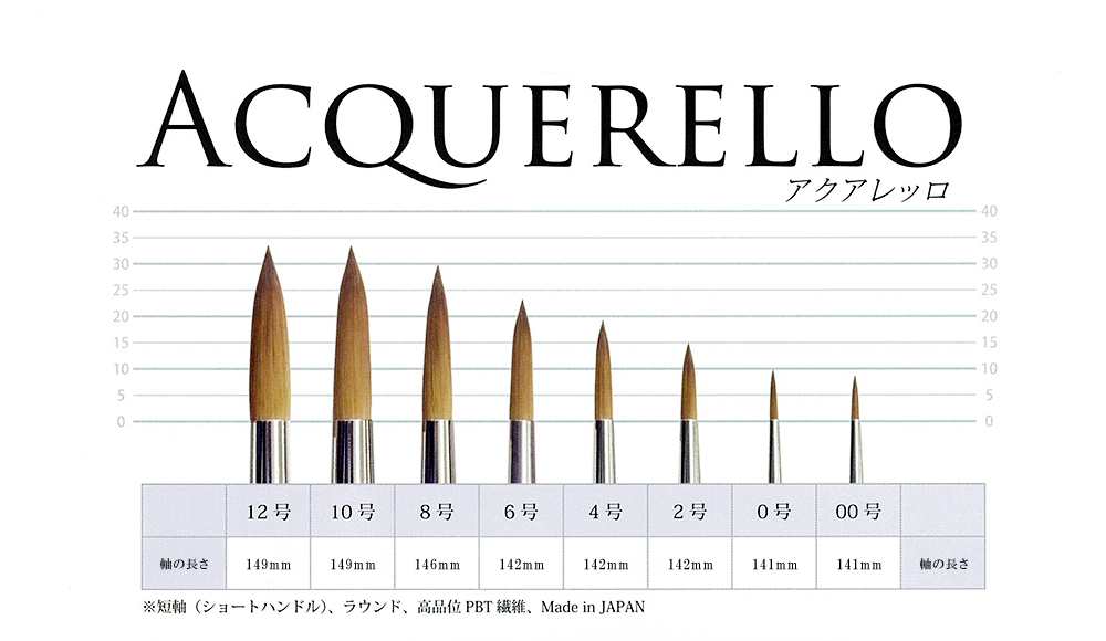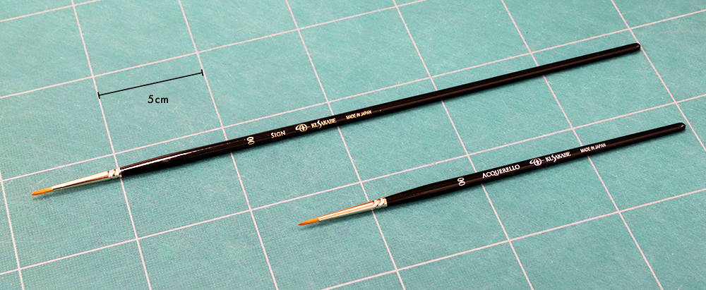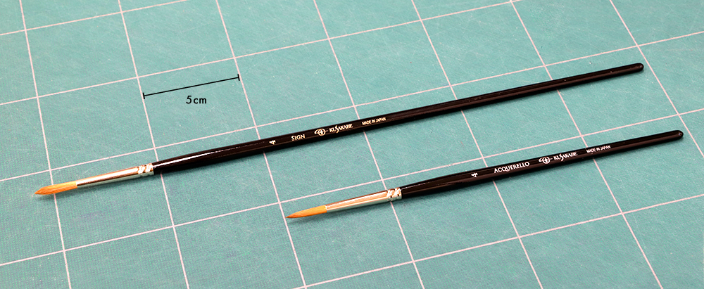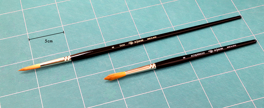 2種の筆の違いは、軸の長さ。アクアレッロが「短軸」、サインが「長軸」となっています。