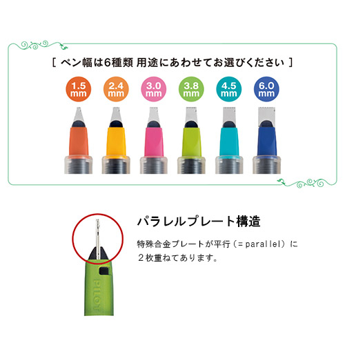 カートリッジ式カリグラフィーペン。ペン先は1.5mm~6.0mmの6種類、インク色は全12色でブライトトーンを基調とした鮮やかな配色ラインナップ。