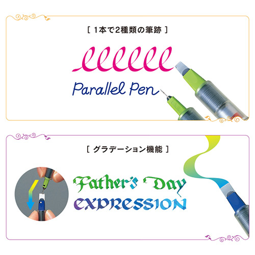 2種類の色のペン先を数秒間タッチさせてから書くと、カンタンにグラデーションが表現できます。インクは水性染料なので、水でぼかすこともできます。