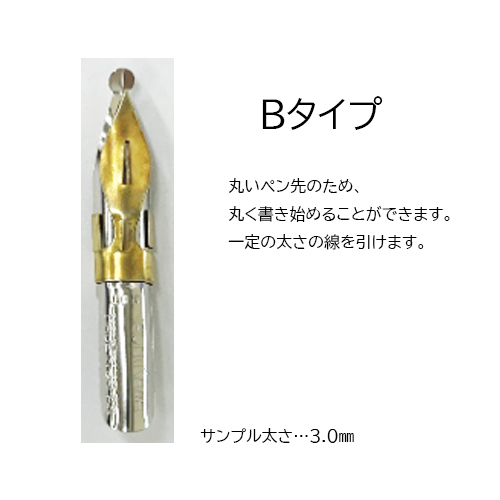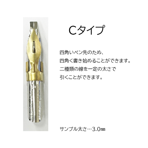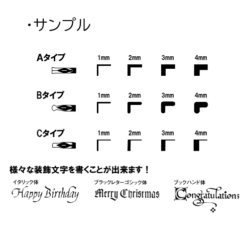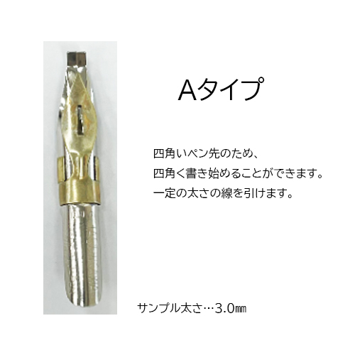 カリグラフィー用のペン先。別売りの「フリーペン軸」につけて使用します。ペン先の形はABCの3パターンで、線幅は0.5~6.0までの各7段階です。