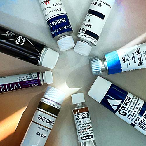 チューブから出した絵具のトーンを少し落ち着かせるために茶・紺・紫などの絵具がよく使われます。バーント・アンバーやプルシャン・ブルー、ミネラル・バイオレットなどが代表的です。絵具をそろえる際は、鮮やかな色だけでなく、渋い色も用意しましょう。