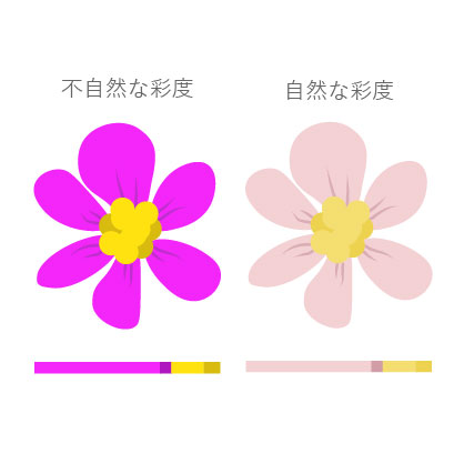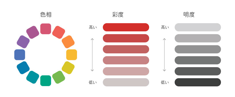 彩度は、「どのくらい鮮やか」かを表します。もっとも鮮やかな色を「純色(ビビットカラー)」といい、色味を感じる色を「有彩色」、色味を感じない色を「無彩色」といいます。