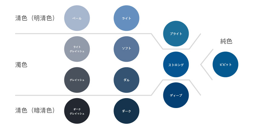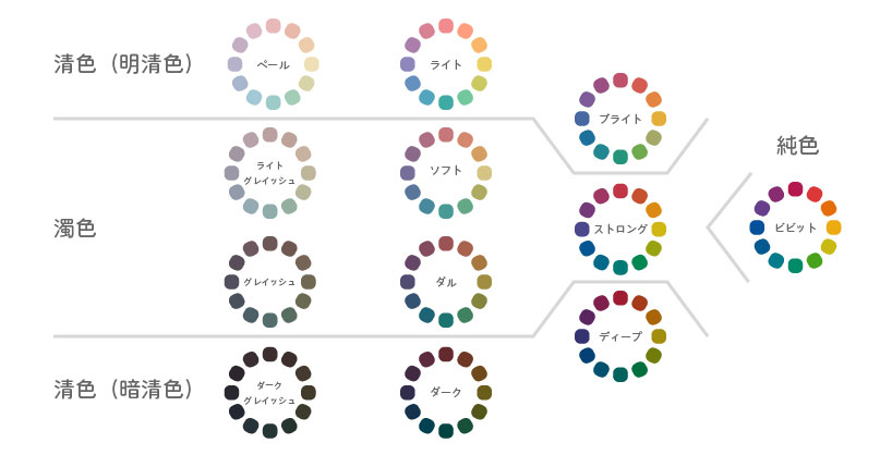 トーンとは、明度と彩度の強弱によって表される色のグループのことをいいます。色相の同じ系列でも、色によって暗かったり明るかったり、濃かったり淡かったりします。これらのトーンをグルーピングして体系化したものをトーンマップといいます。有名なものは、1964年に(一財)日本色彩研究所によって開発された「PCCS(Practical Color Co-ordinate System:日本色研配色体系)」カラーシステムをもとにしたトーンマップです。