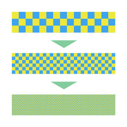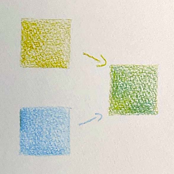 並置混色とは、下の図のように、複数の色が細かく並ぶことによって目の中で色が混ざり合って、中間の色に見えることをいいます。色鉛筆やパステルなどでは、紙の上に乗った顔料が目の中で混ざって見えることによって色が表現されます。