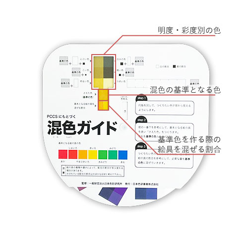 つくりたいと思う色を窓から見えるようにするだけで、混色に必要な純色と白、黒の絵の具の割合が表示されます。色見本はPCCSに準拠した有彩色12色相・7トーンの合計84色で、色のかたよりがないように系統的に選ばれています。