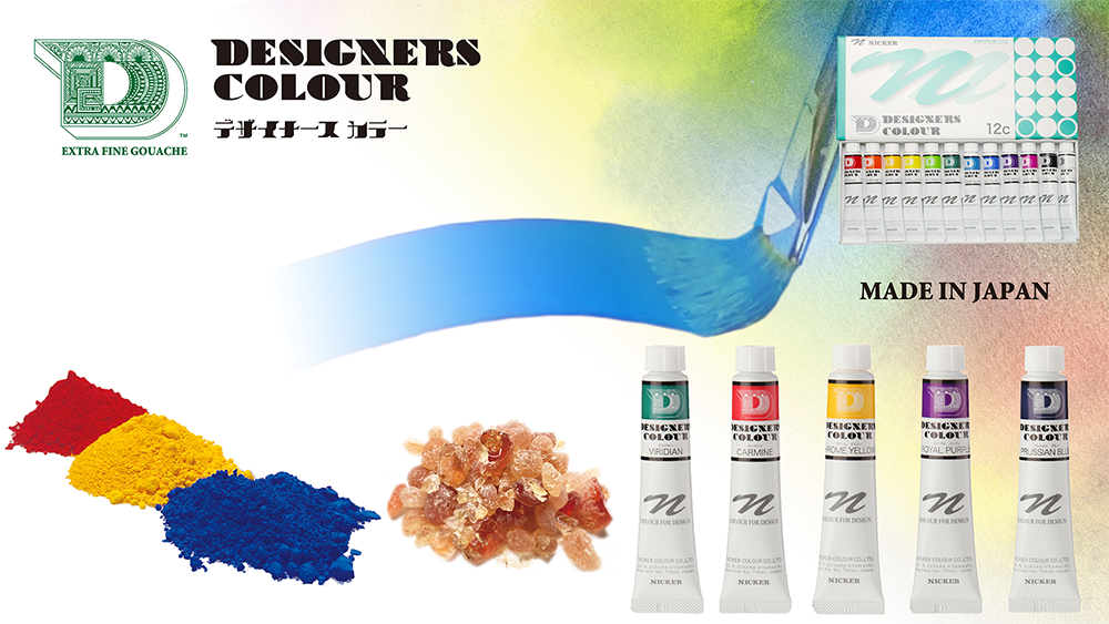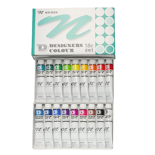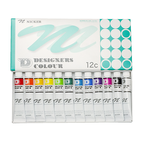 様々なプロから支持を受けているニッカーのポスターカラーですが、そのポスターカラーを超えることを目標に誕生した不透明水彩絵具がデザイナースカラーです。材料にこだわり、添加剤の量を可能な限り抑え、現在の需要に見合った色を再考し製造しました。ニッカーのポスターカラーが深みのある色が多いのに対して、デザイナースカラーは明るく、鮮明な色を揃えています。