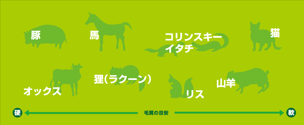 一般には軟毛を使用します。すばやくぼかしたり、長い線描をする場合があるので絵具の含みとコシが大切になります。絵具の含みや筆の弾力は毛質の長さと量により決まってきます。短穂で厚みのあるものは、弾力が強く、長穂はしなやかで弾力は弱くなりますが絵具の含みがよくなります。毛質はコシが強く穂先を生かしたものや、軟らかく含みの良いものなど用途に応じて選びましょう。